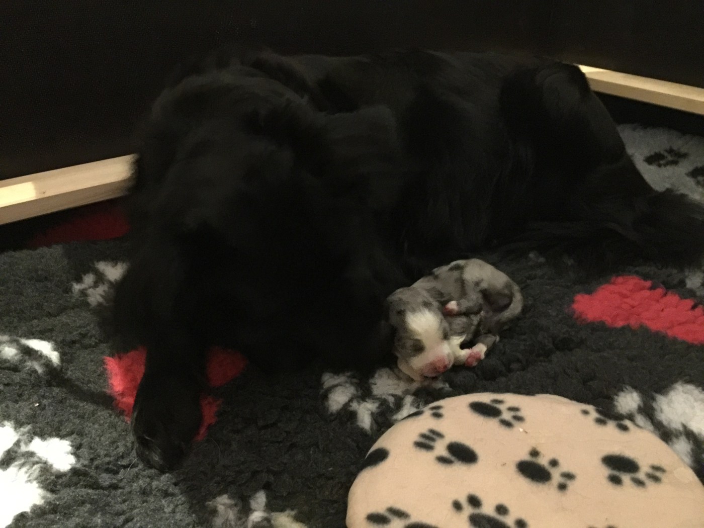 Der große Hund konnte sich noch nicht so recht erklären woher das Baby kommt, darum habe ich 3/4 der Nacht in der Wurfbox liegend verbracht um Mutti zu beruhigen. Ok und um das Baby zu bewundern 😉 Morgens war dann alles schon entspannter. Außer mein Schlafmangel. Aber die kleine Maus, die übrigens Lilith heißt, ist sehr fit und legt ziemlich viele Runden in der Wurfbox zurück, wenn sie was möchte. Sie nimmt auch fleißig zu und hat gestern schon die 500g Grenze geknackt.