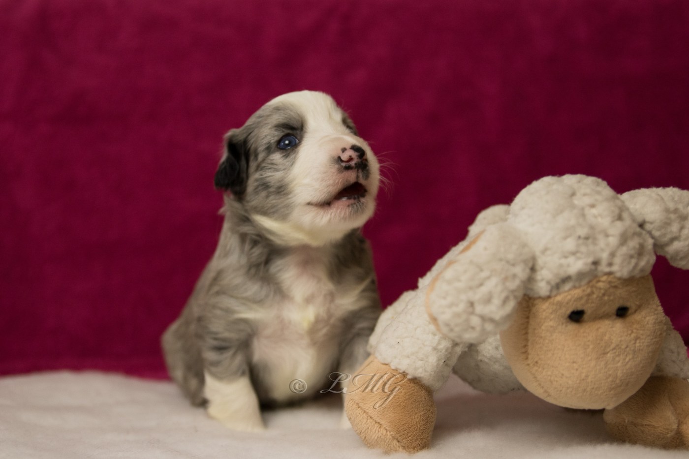 Das Welpi wächst sehr flott. Mit ihren 17 Tagen hat sie schon 5 Tage die Äuglein offen, wackelt munter durch die Gegend, wenn sie gerade nicht schläft und versucht sich im Spiel. Mama hilft ihr ein bisschen und ich hoffe, dass die große Schwester jetzt bald auch mit erziehen darf. Dass sie zu dick wird war auch wein wenig meine Angst, aber bisher ist sie nicht so viel Schwerer als mein 8ter Wurf von vor 4 Jahren. Langsam nimmt sie auch ganz aktiv Kontakt auf.